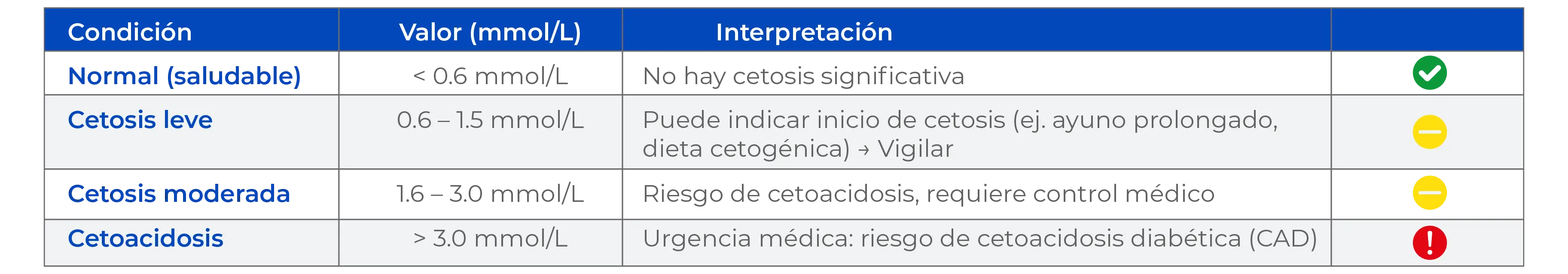 - Cetonas: Ayuda a prevenir la cetoacidosis diabética.